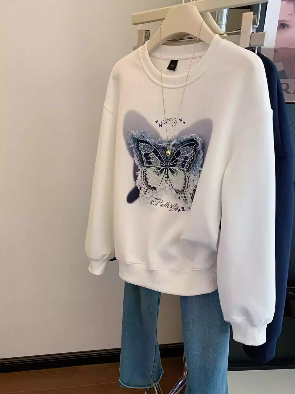 Obsessed with this white crew - neck sweatshirt—it’s “edgy cool + Detail control ecstasy”🔥! The 3D denim - patched butterfly is a showstopper: frayed edges + gradient blue wings, like wearing a butterfly specimen. Subtle shadow print, “PSY” letters + tiny butterflies in the back? Full of hidden details! Paired with a gold necklace (the bead pendant is chefs kiss), the loose fit flatters all body types. For daily hangs or street - style spots, slip it on and own the “effortless cool” vibe—fashion magic in every step!